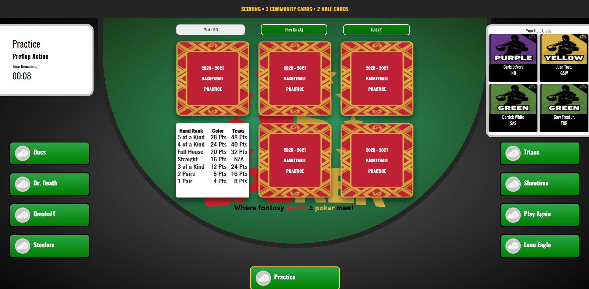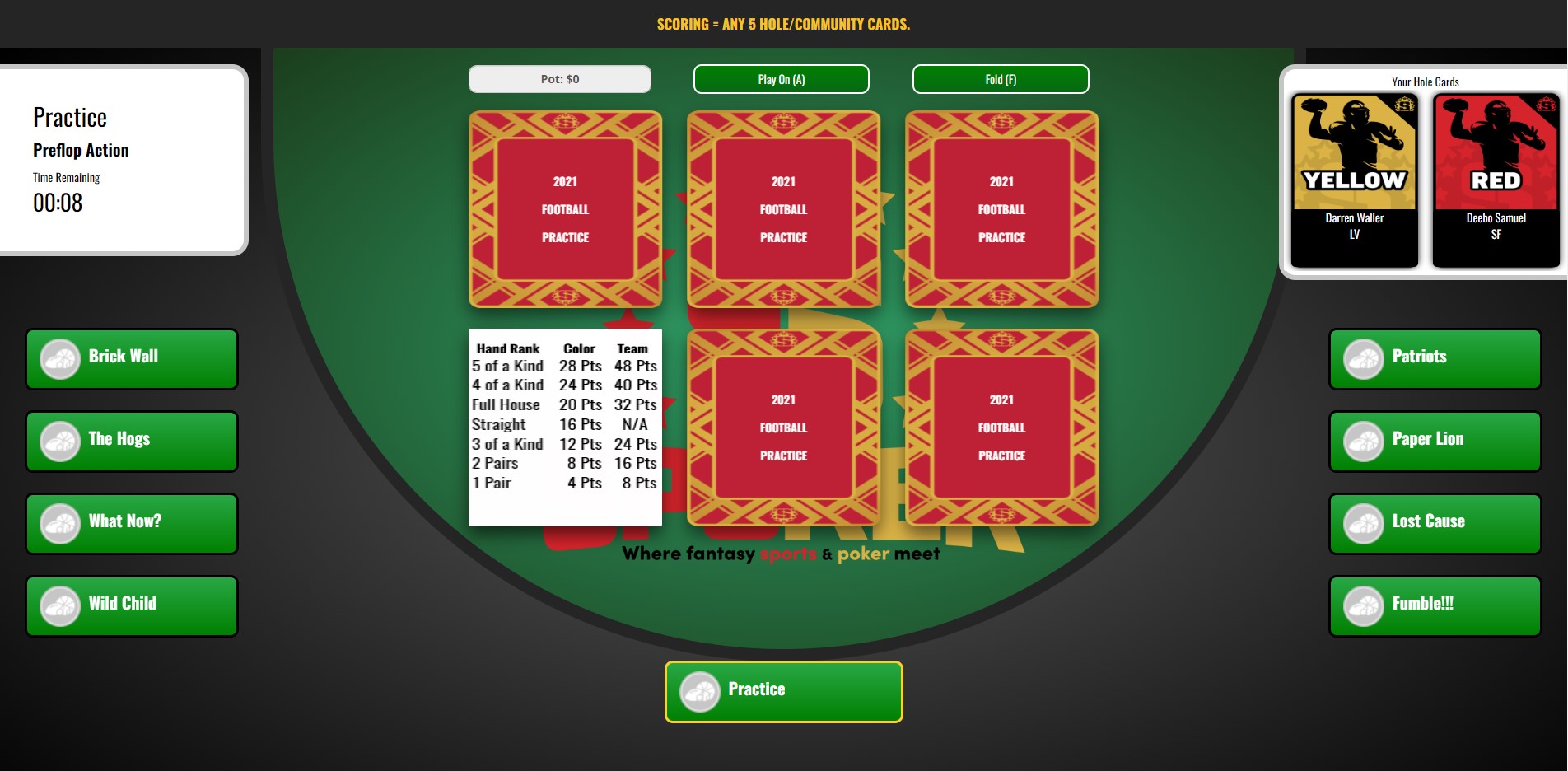 Object of the Game - Contestants play a one round Hold 'Em format with the goal of trying to accumulate the highest 5 card fantasy point total. At the same time, they also try to secure as many bonus points as possible.
